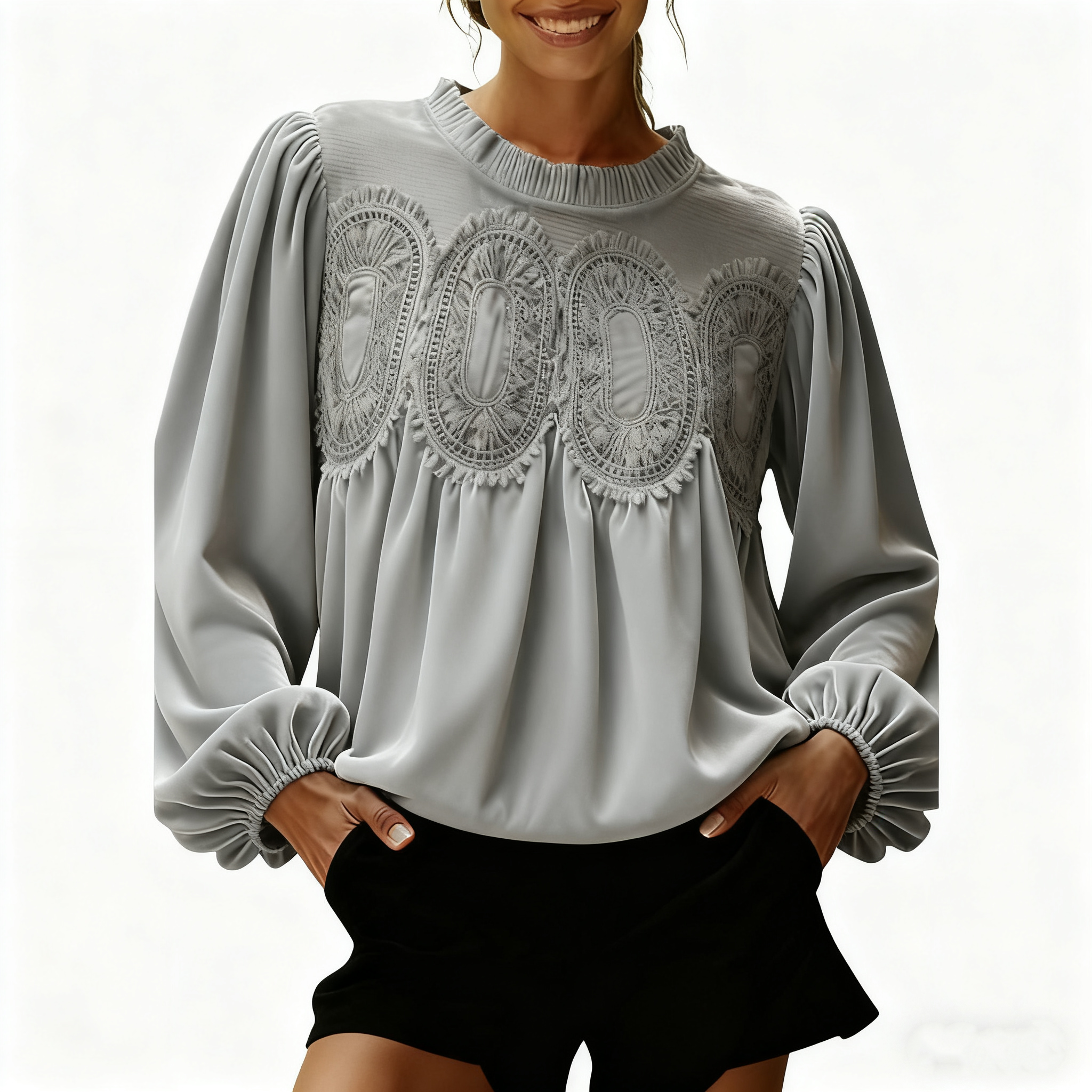 ·Year-Round Staple: Transitions seamlessly from day to evening.·Image Description:·Round Neck Blouse: Features a long sleeve design with delicate lace trim.·Flared Silhouette: Adds a feminine touch to the overall look.·Soft Flowing Hem: Creates a graceful appearance.
